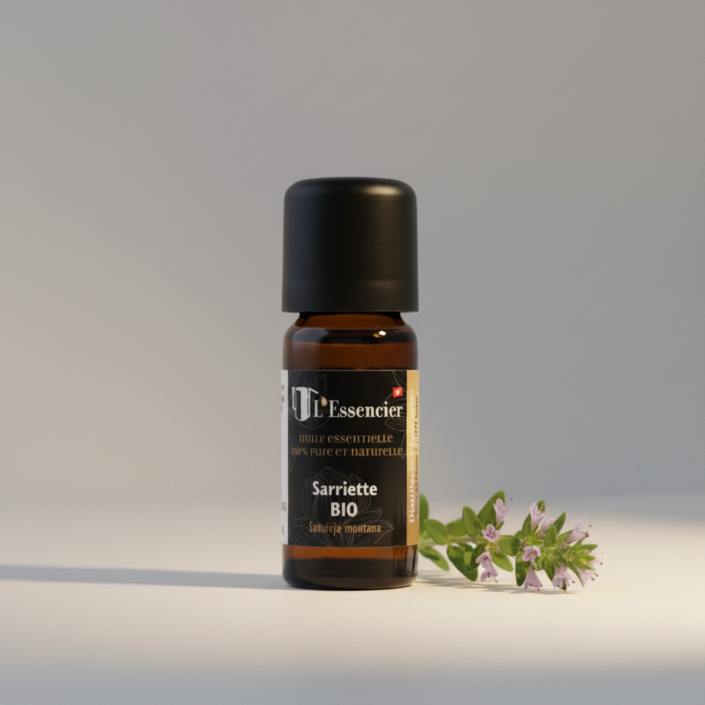 Particularité de la plante : La Sarriette (Satureja montana), aussi appelée Sarriette des montagnes, est une plante aromatique originaire du bassin méditerranéen. L'huile essentielle est extraite par distillation des sommités fleuries. La distillation se fait directement dans notre distillerie à Icogne. Elle est connue pour son parfum épicé, chaud et légèrement poivré, ainsi que pour ses puissantes propriétés antibactériennes et stimulantes.