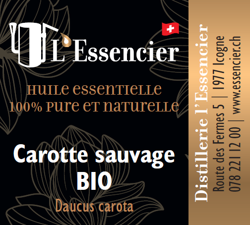 Particularité de la plante : La Carotte Sauvage (Daucus carota) est une plante herbacée bisannuelle originaire d'Europe. Son huile essentielle est extraite par distillation à la vapeur d'eau. Nous la cultivons et distillons à Icogne dans notre distillerie. Elle est reconnue pour son parfum doux et terreux, ainsi que pour ses propriétés régénérantes et détoxifiantes.