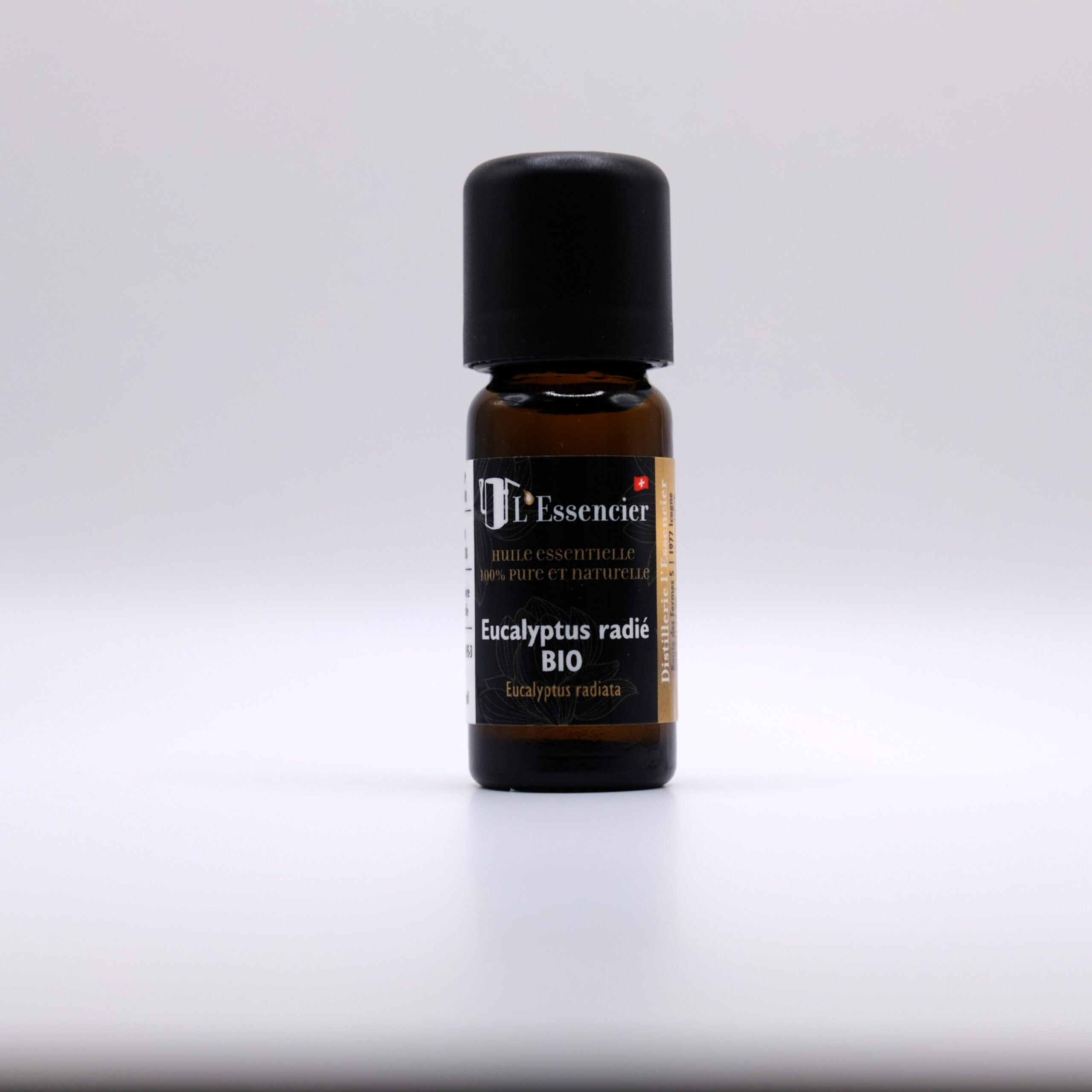 Particularité de la plante : L'Eucalyptus Radié (Eucalyptus radiata) est un arbre originaire d'Australie, apprécié pour son feuillage persistant et son parfum frais et camphré. L'huile essentielle est extraite par distillation des feuilles. Appréciée pour son parfum frais et légèrement mentholé, elle est couramment utilisée en aromathérapie pour ses puissantes propriétés expectorantes et antiseptiques.