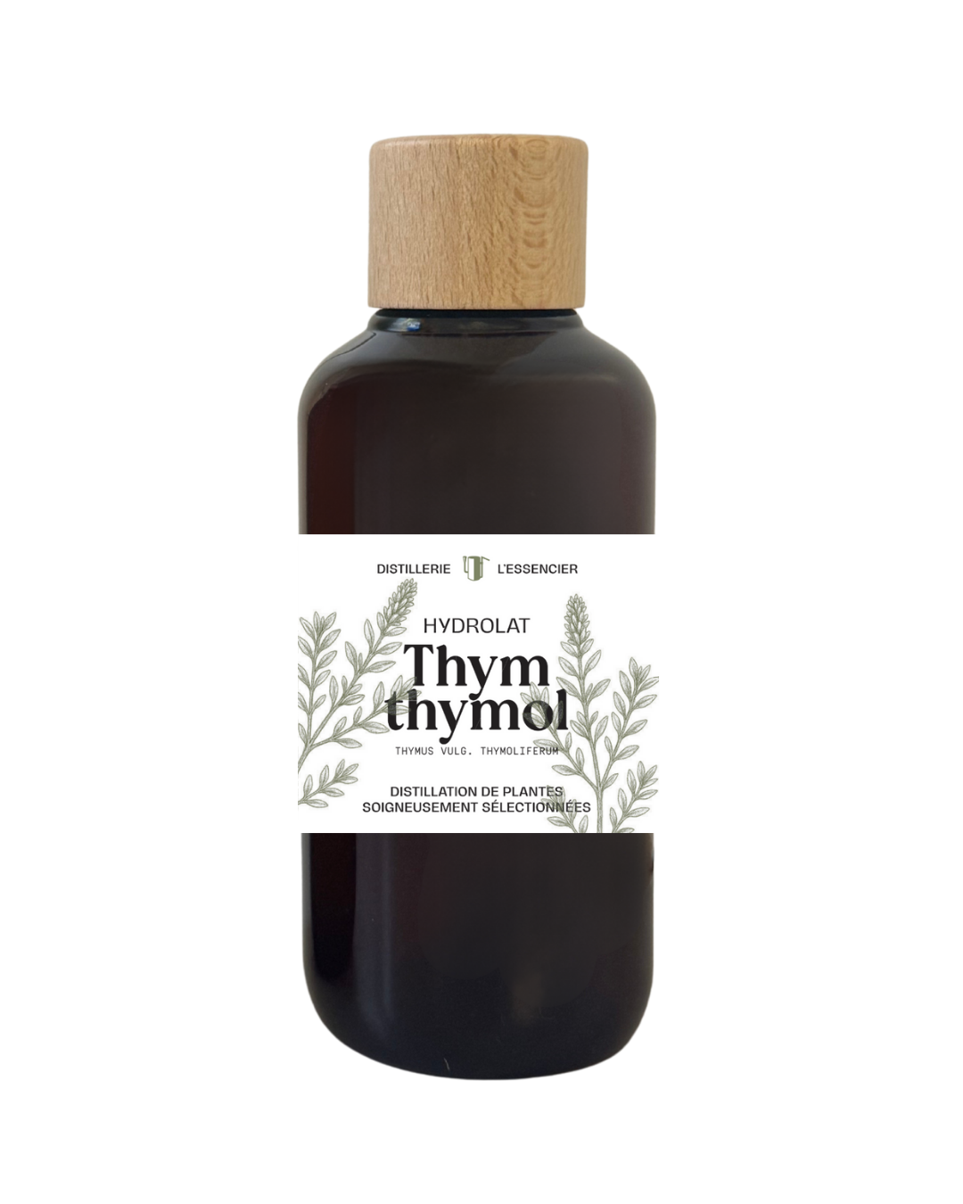 Particularité de la plante : Le Thym Thymol (Thymus vulgaris), connu pour ses propriétés antiseptiques et antibactériennes, est une variété de thym particulièrement riche en thymol, un composé actif réputé pour ses vertus purifiantes. L’hydrolat de Thym Thymol est utilisé pour renforcer le système immunitaire, lutter contre les infections et purifier la peau. C'est un allié naturel contre les troubles respiratoires et cutanés, offrant une large gamme d'applications en aromathérapie.